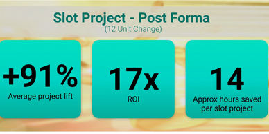 After choosing VizExplorer’s Slot Recommendation Engine (SRE) to drive efficiencies with the analysis process and increase floor performance, the casino had a successful first slot project. The 12-unit change yielded an average project lift of +91%, and the aggregated one-month total net lift provided an ROI that covered the monthly cost of SRE 17x over.